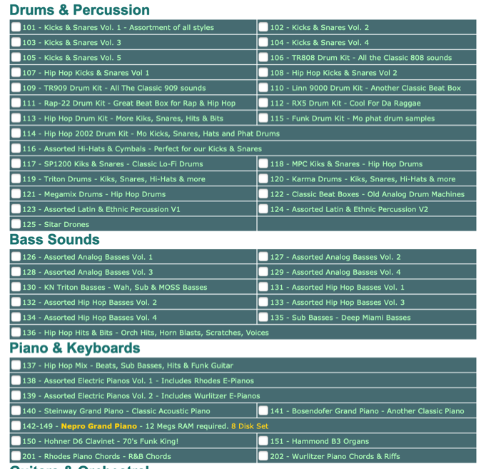 Please Note: Our Akai sounds are now available as "Disk Images" only and delivered by our free "Download Delivery". Please check the above link, which fills you in on exactly how it works. We've tried to provide the sounds on floppy disks for as long as possible. However, I'm sorry to say that we have discontinued delivering libraries on floppy disk. The good news is the disk image files are exactly the same as the floppys and cost much less. You just have to create your own floppys from the images. We provide a app that lets you do that. Or, if you have a USB Floppy Drive Emulator connected to your sampler that replaces the floppy drive, you can save the images to that device and load the sounds from that.
