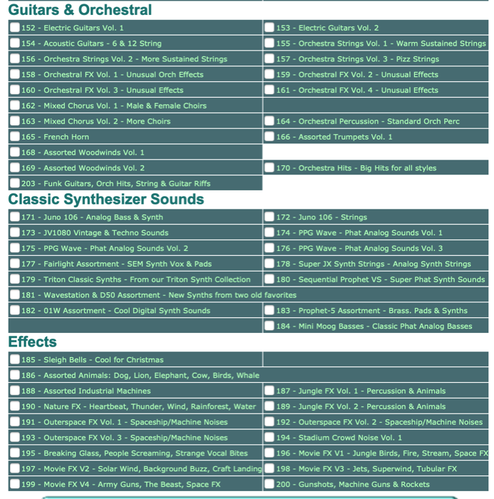 Please Note: Our Akai sounds are now available as "Disk Images" only and delivered by our free "Download Delivery". Please check the above link, which fills you in on exactly how it works. We've tried to provide the sounds on floppy disks for as long as possible. However, I'm sorry to say that we have discontinued delivering libraries on floppy disk. The good news is the disk image files are exactly the same as the floppys and cost much less. You just have to create your own floppys from the images. We provide a app that lets you do that. Or, if you have a USB Floppy Drive Emulator connected to your sampler that replaces the floppy drive, you can save the images to that device and load the sounds from that.